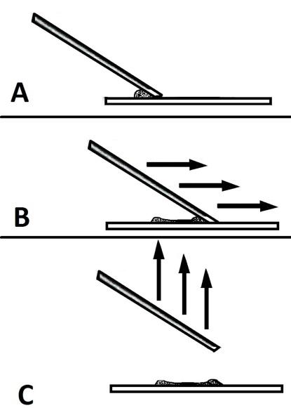 Schemat przedstawiający zasadę wykonywania rozmazów z liniowa koncentracja komórek. A – do kropli płynu znajdującego się na szkiełku podstawowym pod kątem około 45 stopni przystawia się krawędź szkiełka rozmazującego, którym będzie wykonywany rozmaz. B – szkiełko rozmazujące przesuwa się w kierunku przeciwległego końca szkiełka na której znajduje się materiał płynny – w ten sposób materiał jest rozprowadzany na szkiełku podstawowym. C- szkiełko rozmazujące odrywa się od szkiełka podstawowego i unosi prostopadle do góry – powoduje to wytworzenie linii płynu bogatej w komórki. |